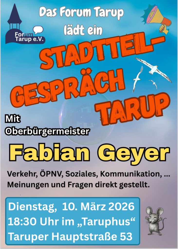 Stadtteilgespräch mit Fabian Geyer in allgemeine-Veranstaltungen, Bürgertreffen, Forum Tarup Datum 10. März 2026 Zeit 18:30 Tarup Hus Taruper Hauptstr. 53, 24943 Flensburg